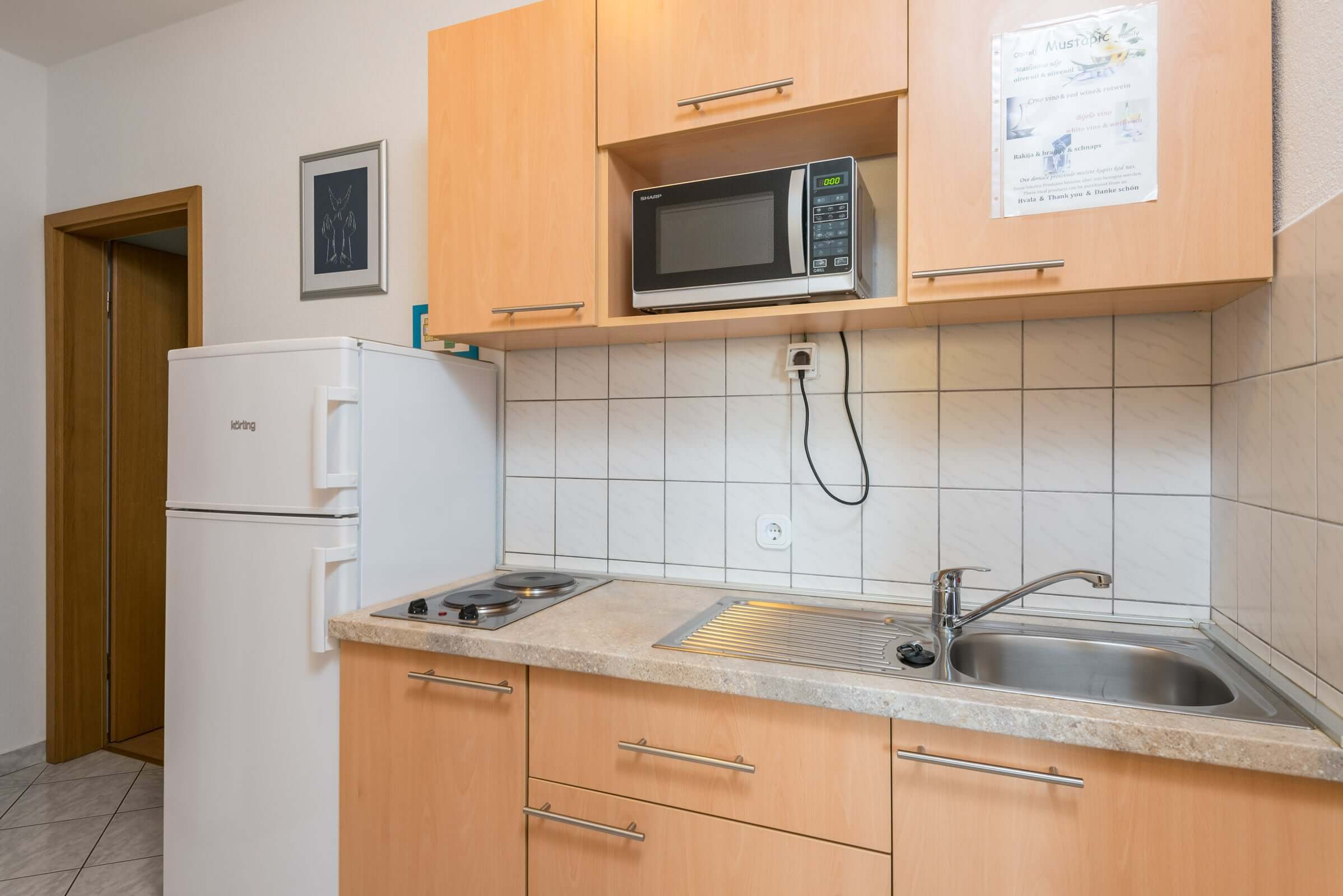 consists of two bedrooms, each with a double bed, a living room with an additional bed for one person, a TV (LCD) set (satellite transmission) and air-conditioning system, a bathroom with a shower and a toilet, a completely supplied kitchen (+ dishwasher + microwave + a coffee machine) and a balcony with a beautiful sea view. The guests can use a parking lot in front of the house and the barbecue in the garden.